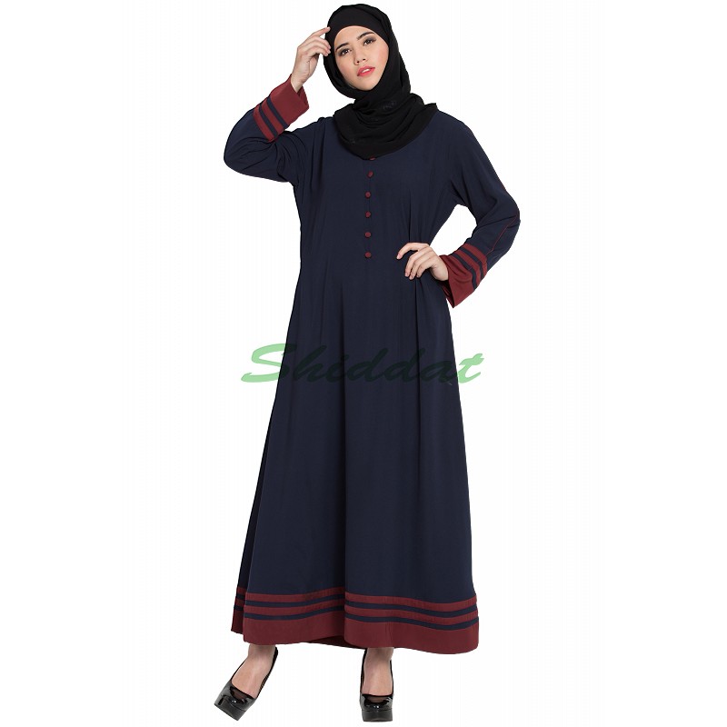 Casual abaya online in India- A line abaya | Navy Blue with Maroon stripes
