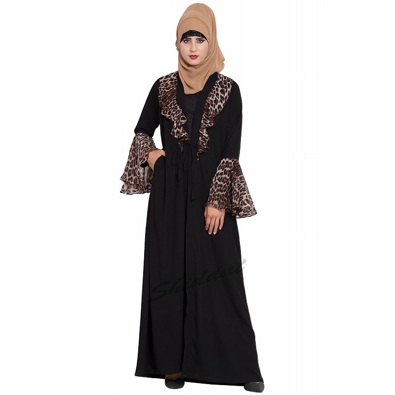 This is a perfect cardigan for hijabis who love to wear Jeans and a Top but still care for their modesty. It is a Front Open Abaya Like Cardigan with No buttons but only a ribbon to be tied up. Animal Print Sleeves and Frills make it very stylish. This article is made of Printed Georgette and Nida (Matte Finish) fabric which is very Soft, Breathable, Light Weight and easy to maintain. It gives a good fall to the garment.
