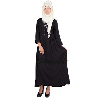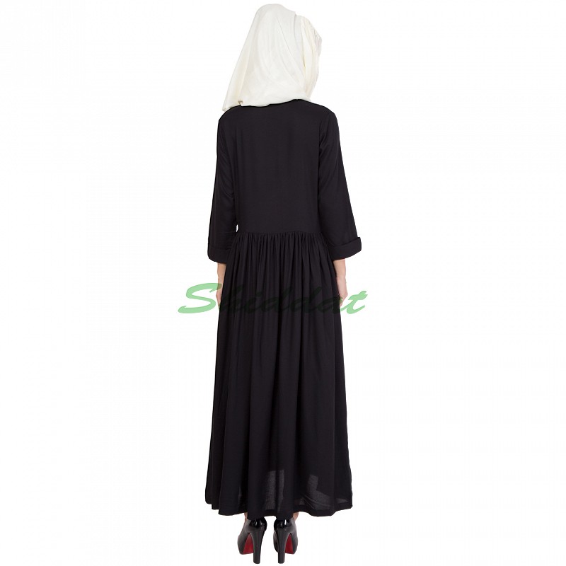 Gone are the days when you have to wear a bland and plain black burkha. Explore our wide range of designer burkhas and frock style abayas from the house of Mushkiya offered by Shiddat exquisitely designed by professional designers from around the country. This beautifully designed frock style abaya in Black color with gathered stitches around the waist is unique and has its own character - be it for daily wear or for an evening / wedding go ahead and adorn your designer abaya and be the SHOW STOPPER of the Evening !