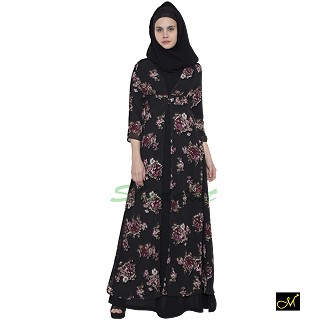 Beautifully designer black colored abaya with flower printed shrug on black base is designed by Mushkiya. This whimsical shrug abaya drapes like a dream, crafted from comfortable Kashiboo. Cut in a loose yet flattering silhouette, this will become one of your favourites in no time. This abaya is made of very comfortable fabric with additional shrug layer at front.