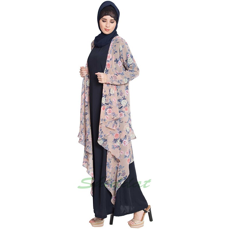 Shrug abaya online - Blue color abaya with Beige printed shrug | Nida matt-Georgette