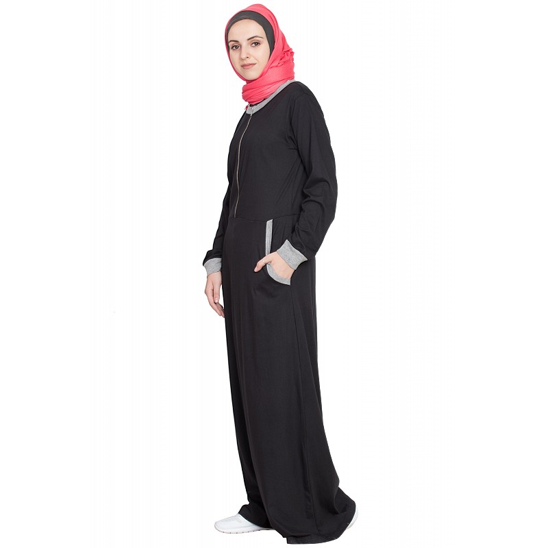 Cuff Travel abaya, Cotton jersey Travel cum sports abaya, Soft, stretched and comfortable, Slant pocket at the waist joint with contrast pocket band, contrast neckband and cuff, easy to wear. Front open till waist with metal Zip for a sporty look.